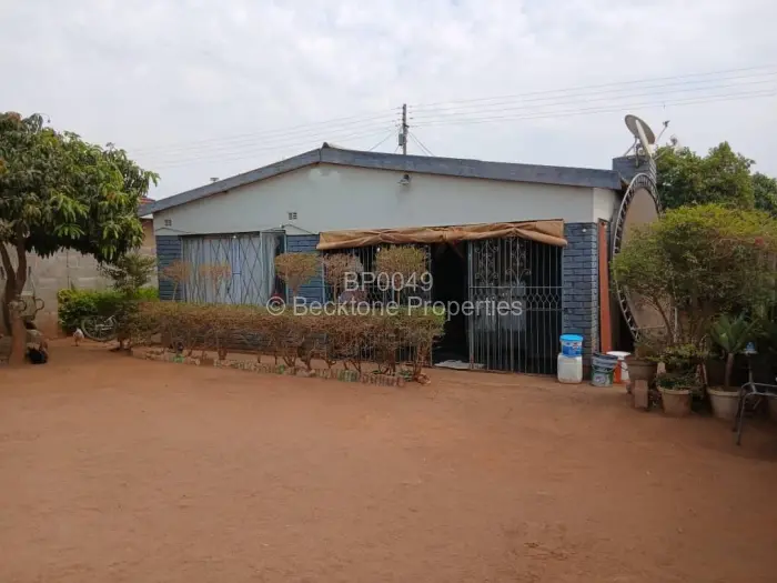 Nketa 9 House For Sale is a delightful residential property in the heart of Bulawayo. As you approach, the exterior front view reveals a charming single-story home painted in a light hue with an inviting darker blue trim. The gated entrance is enhanced by ornamental metalwork, leading to a compact, well-kept yard adorned with landscaped hedges and potted plants that provide a welcoming atmosphere.