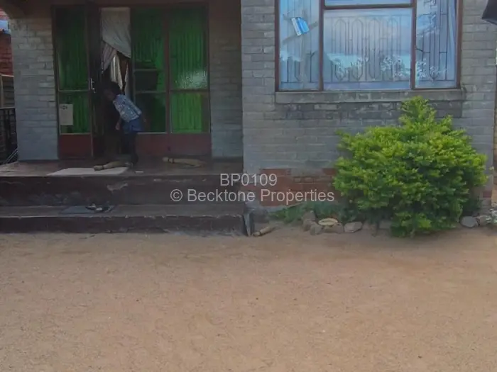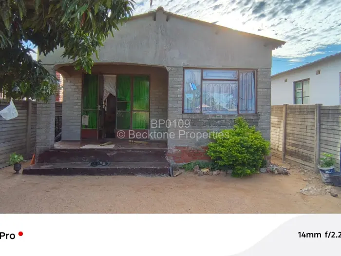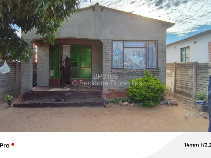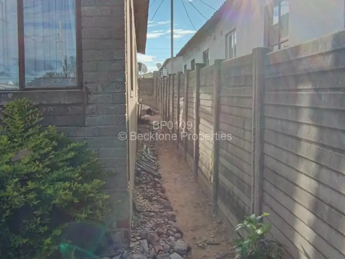In Pumula South, Bulawayo, a standalone house set on a 200sqm plot with a walled and fenced boundary. Timber fencing runs along both sides of the yard, with a mature tree marking the left boundary.